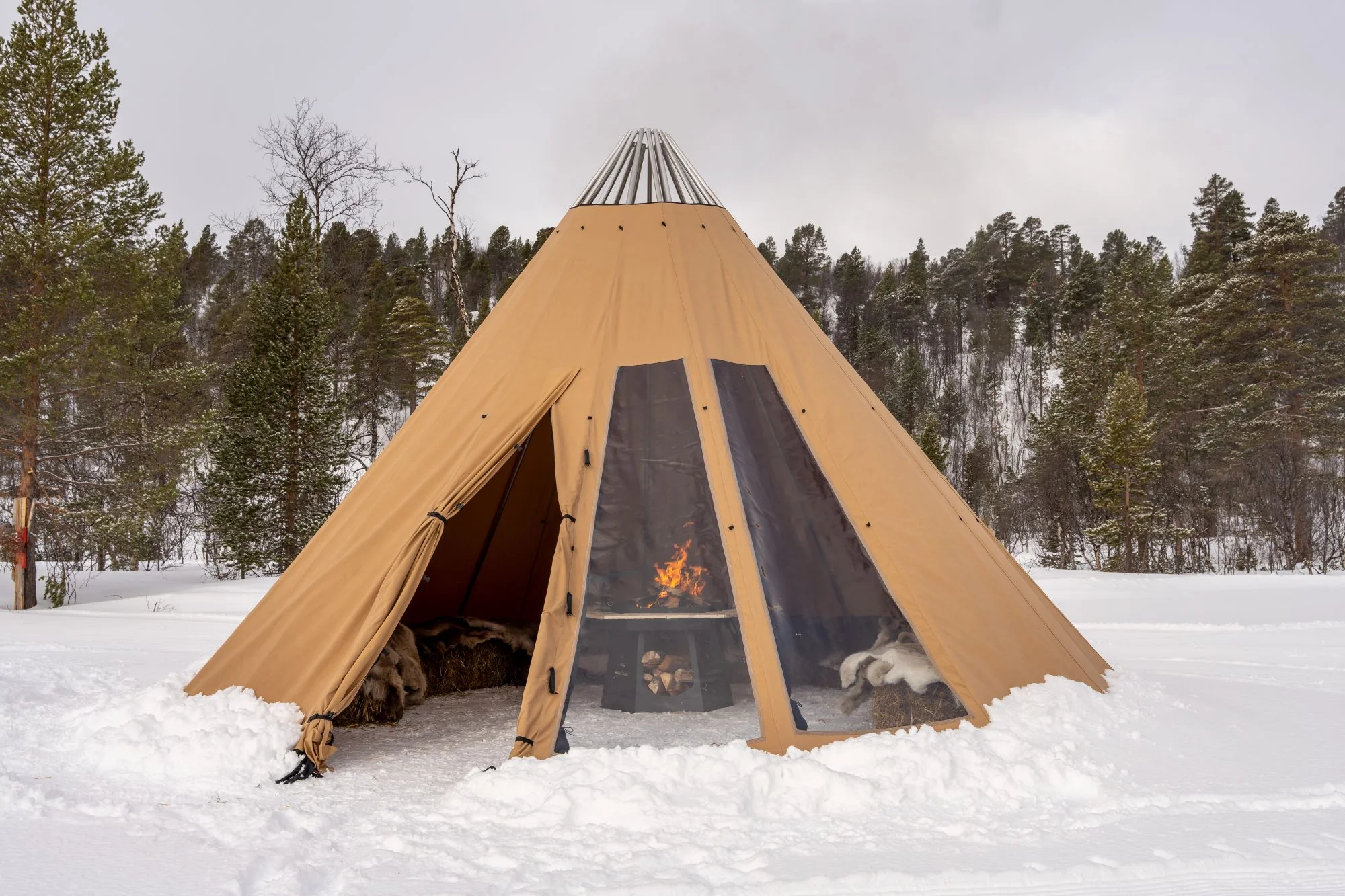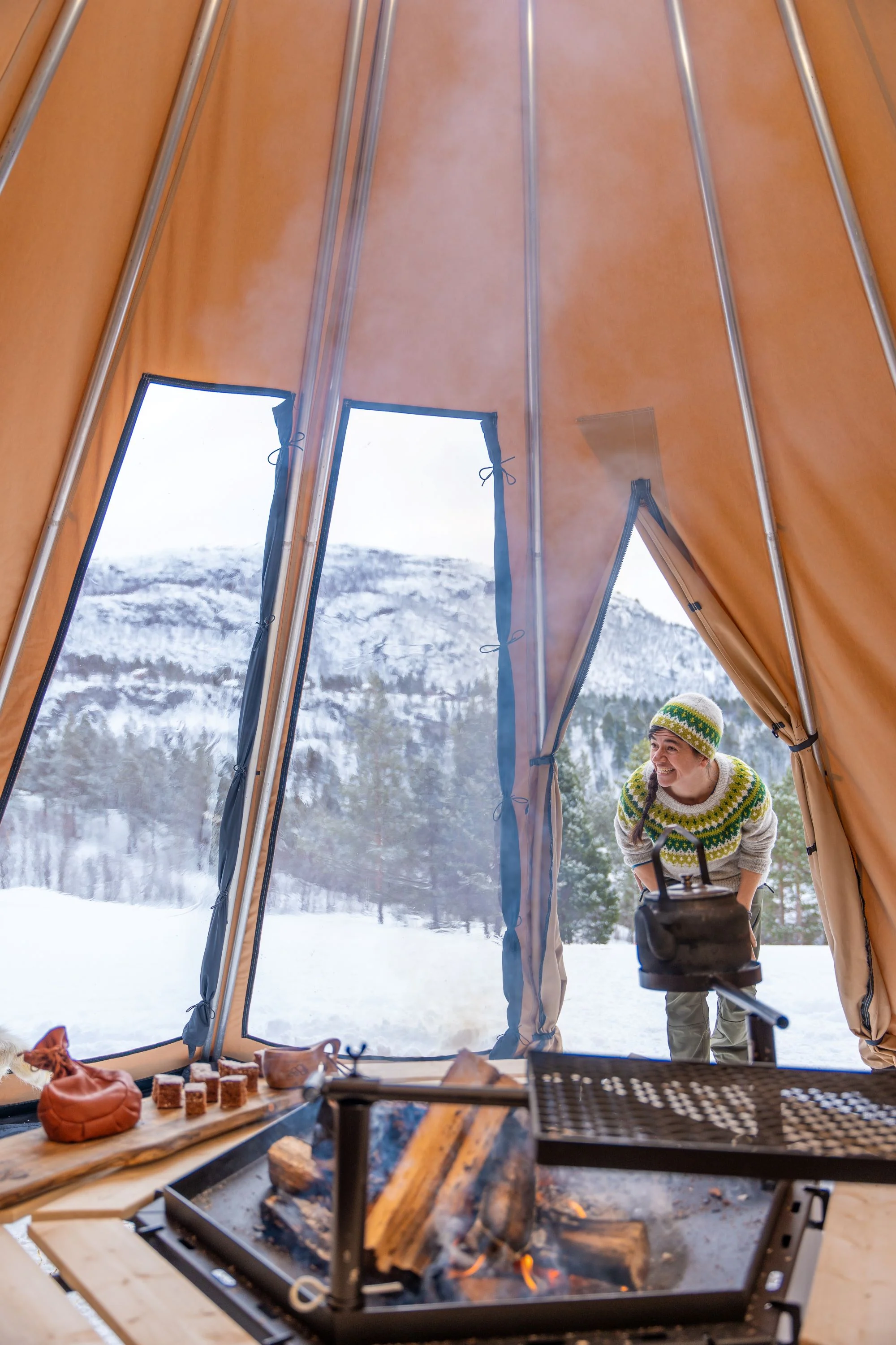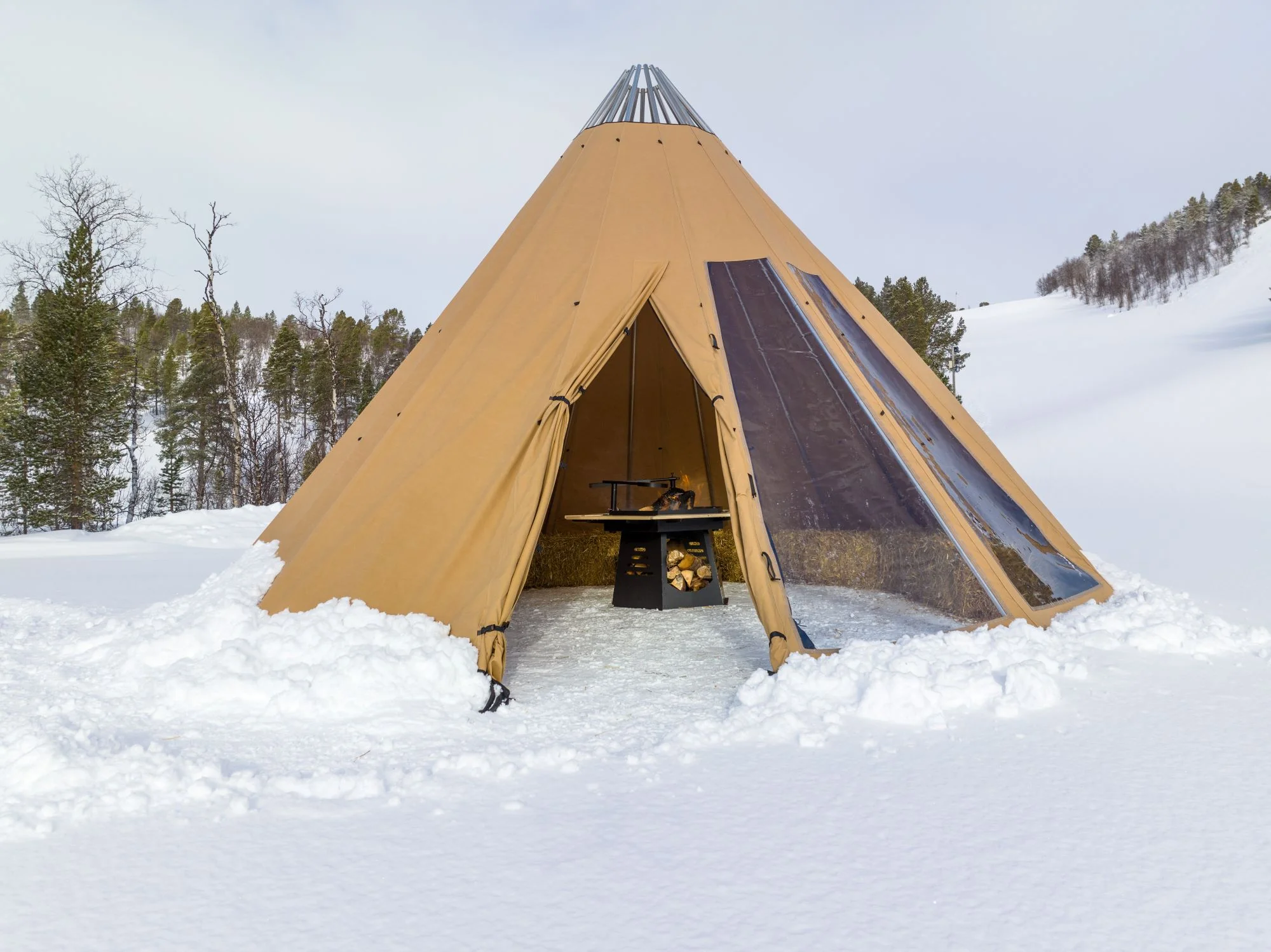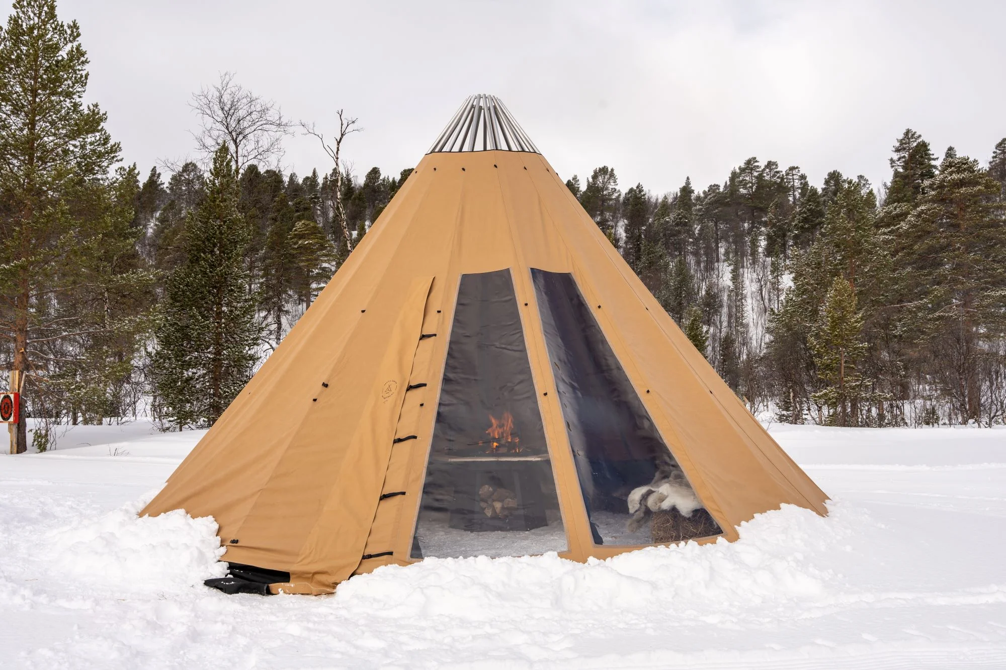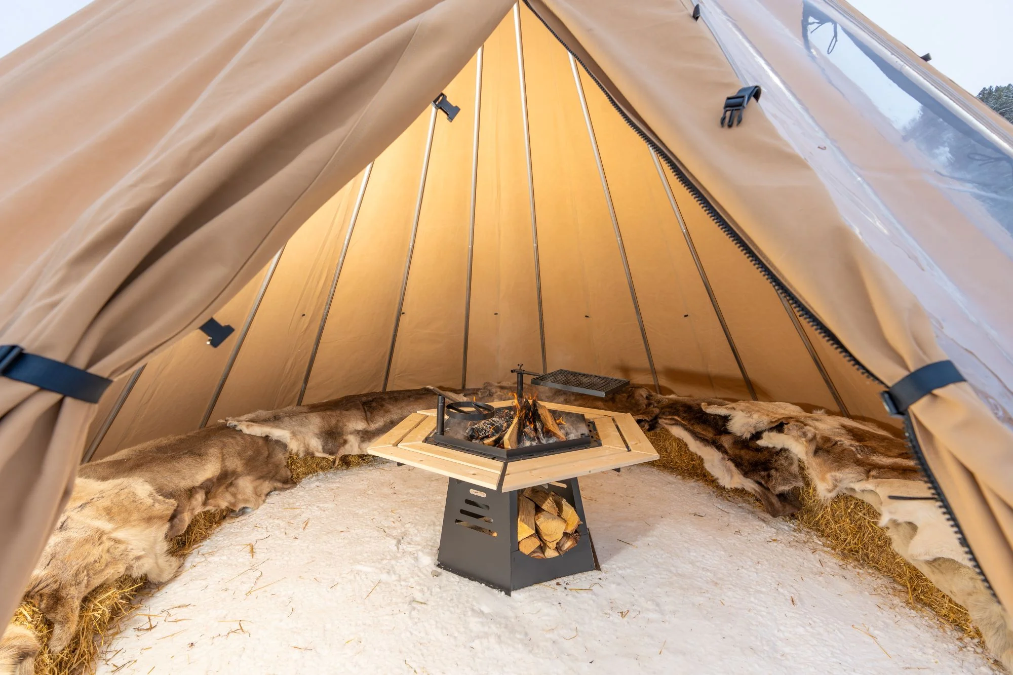 - Avtagbar ovnshatt med pipegjennomgang. Dersom du ønsker fyring med bål, må lavvoen brukes uten ovnshatt slik at røyken kan slippe ut.
