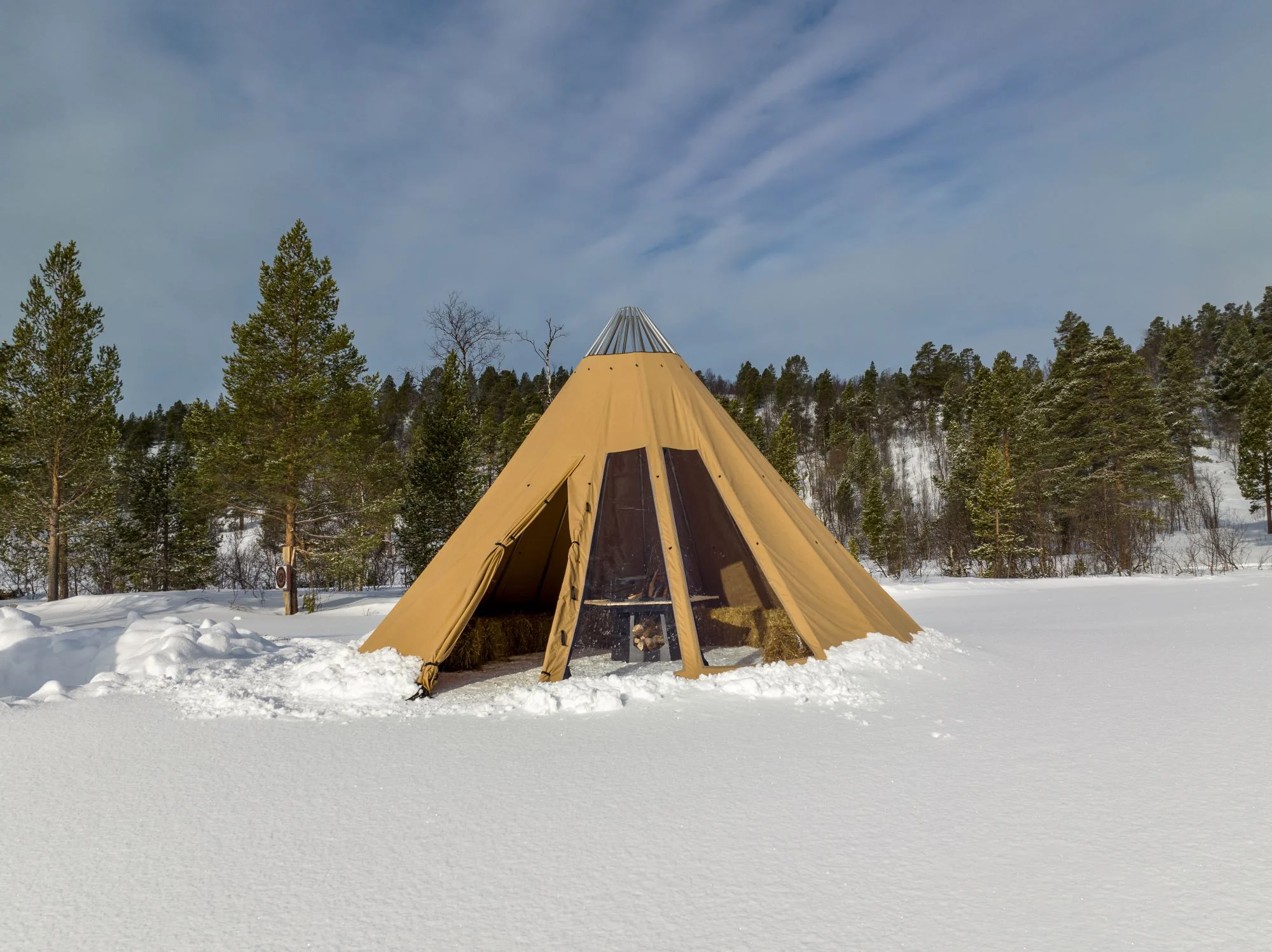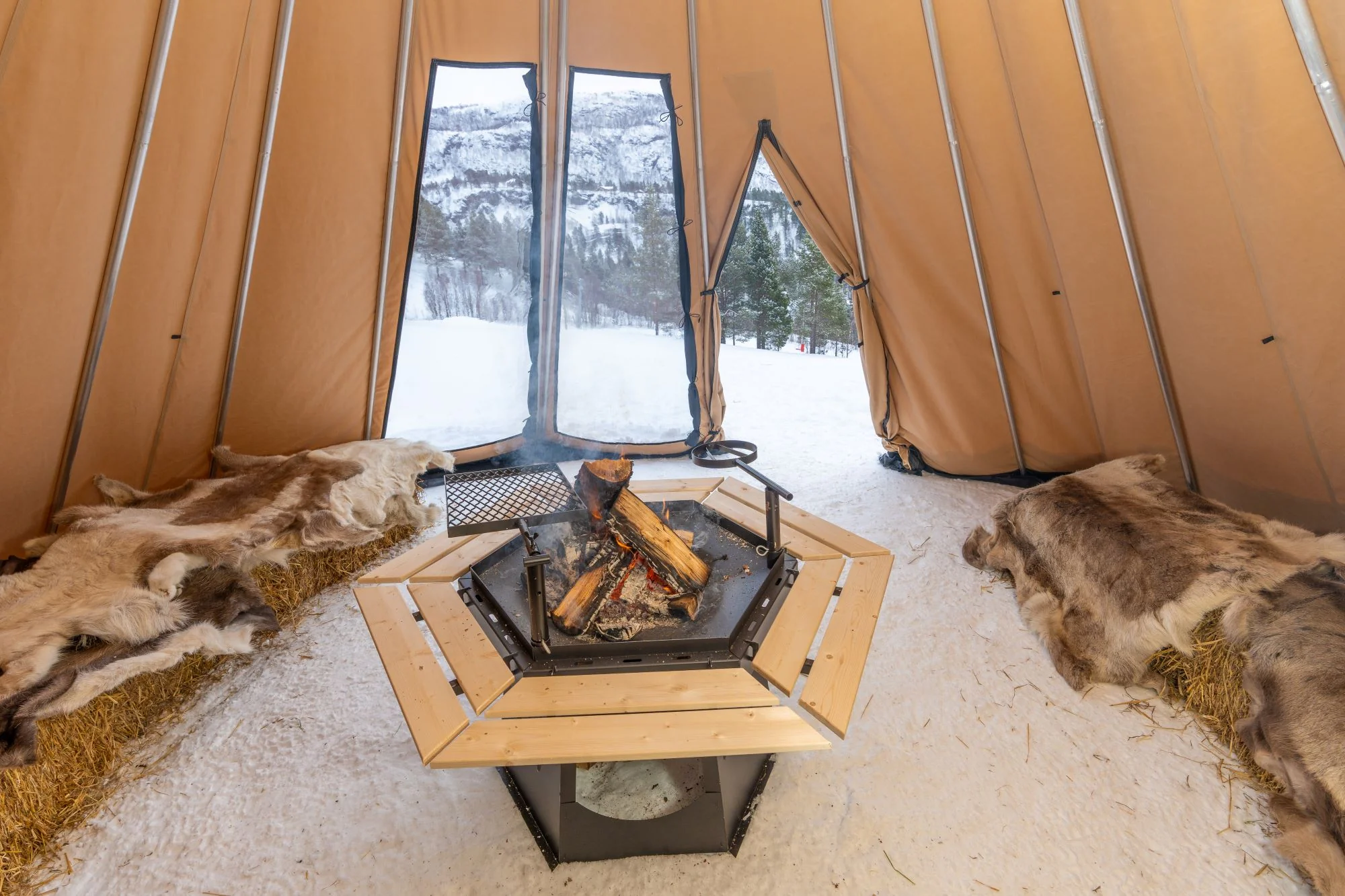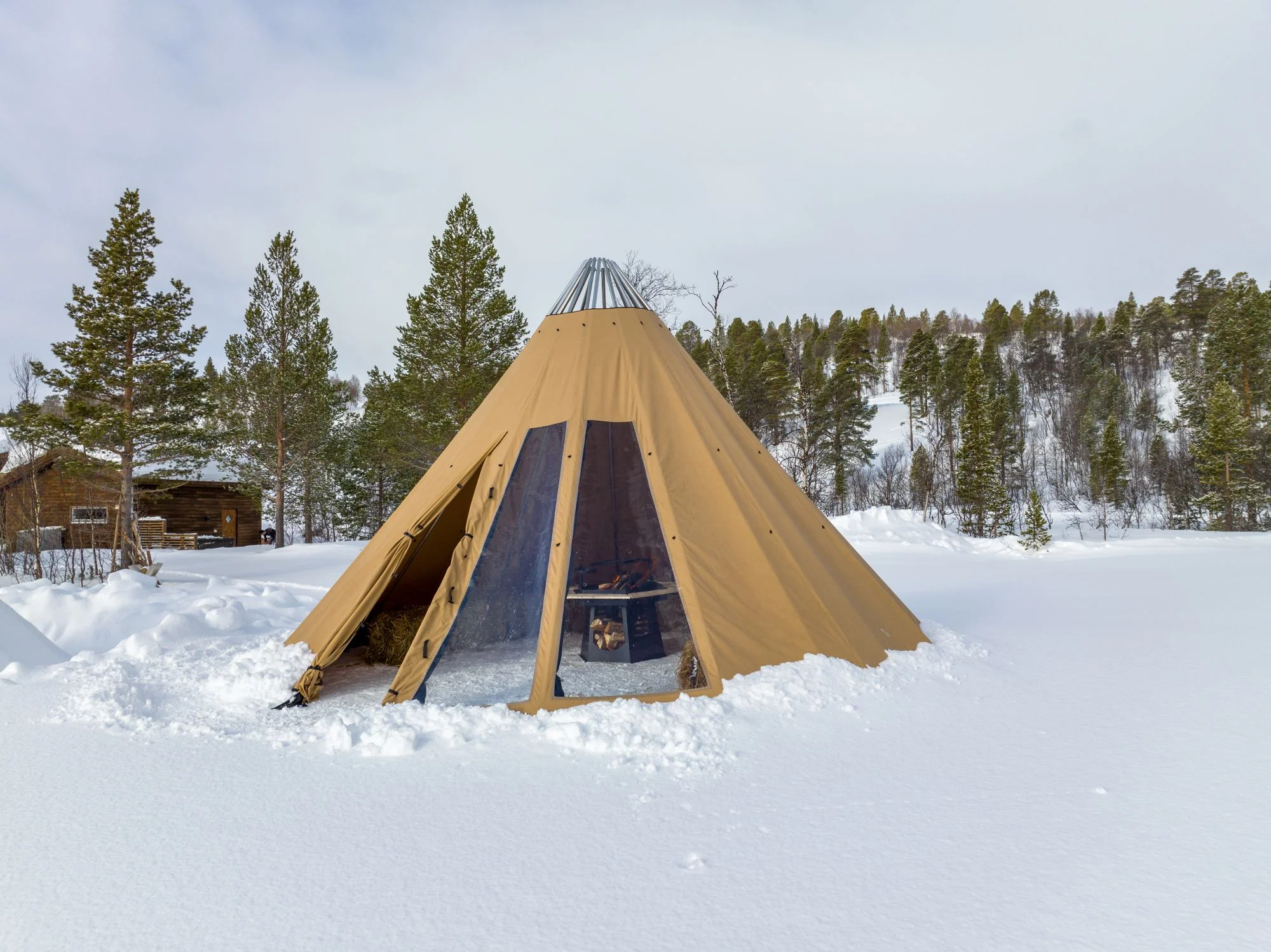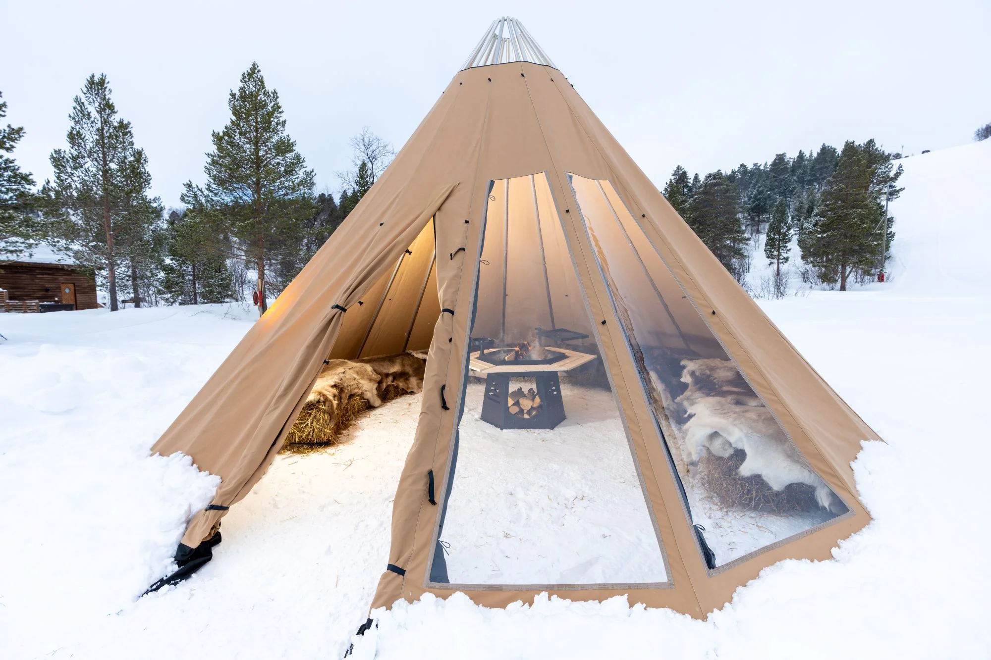 - Avtagbar ovnshatt med pipegjennomgang. Dersom du ønsker fyring med bål, må lavvoen brukes uten ovnshatt slik at røyken kan slippe ut.