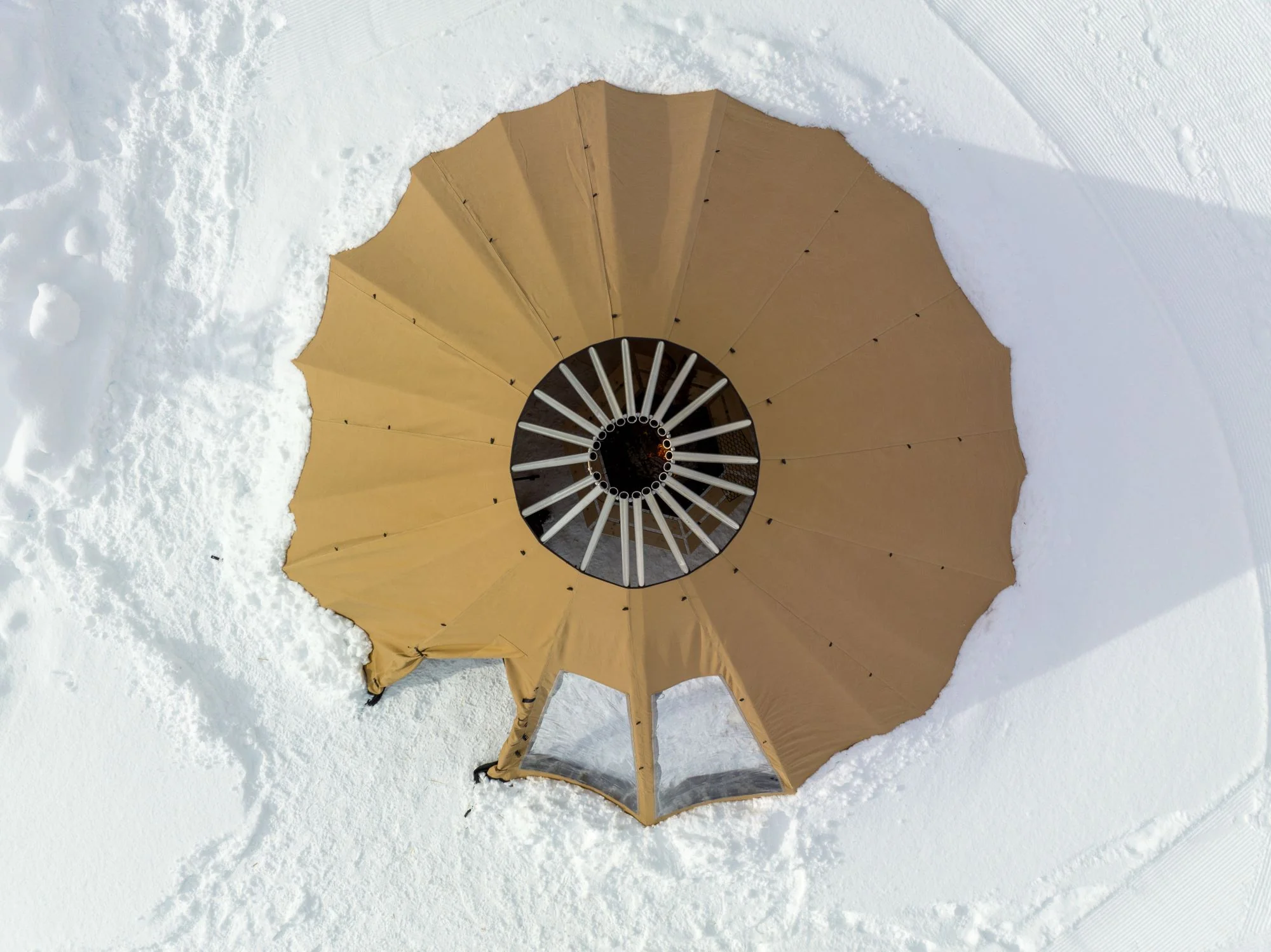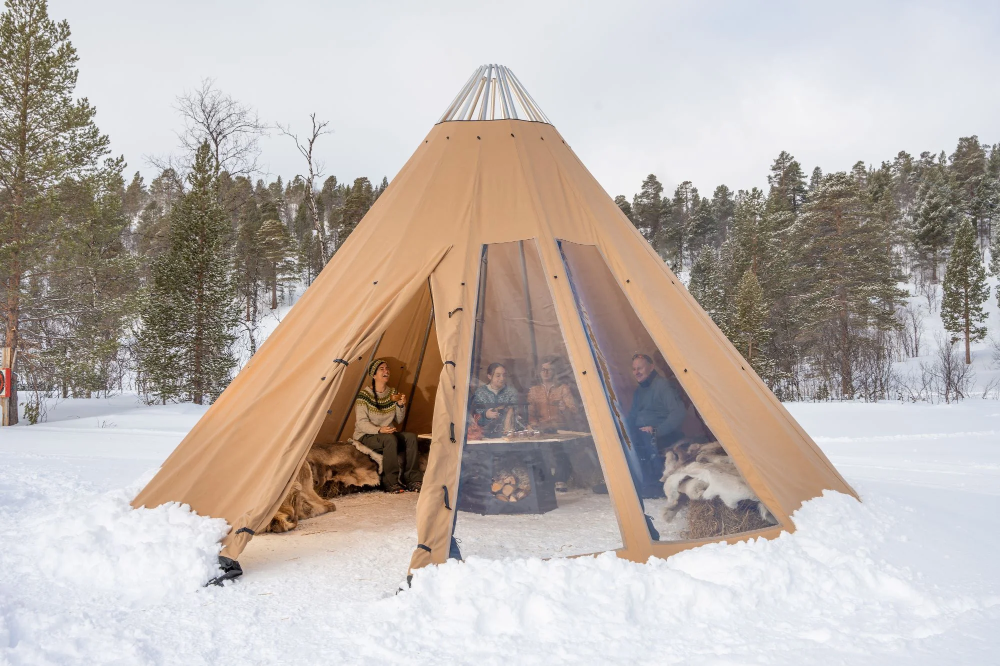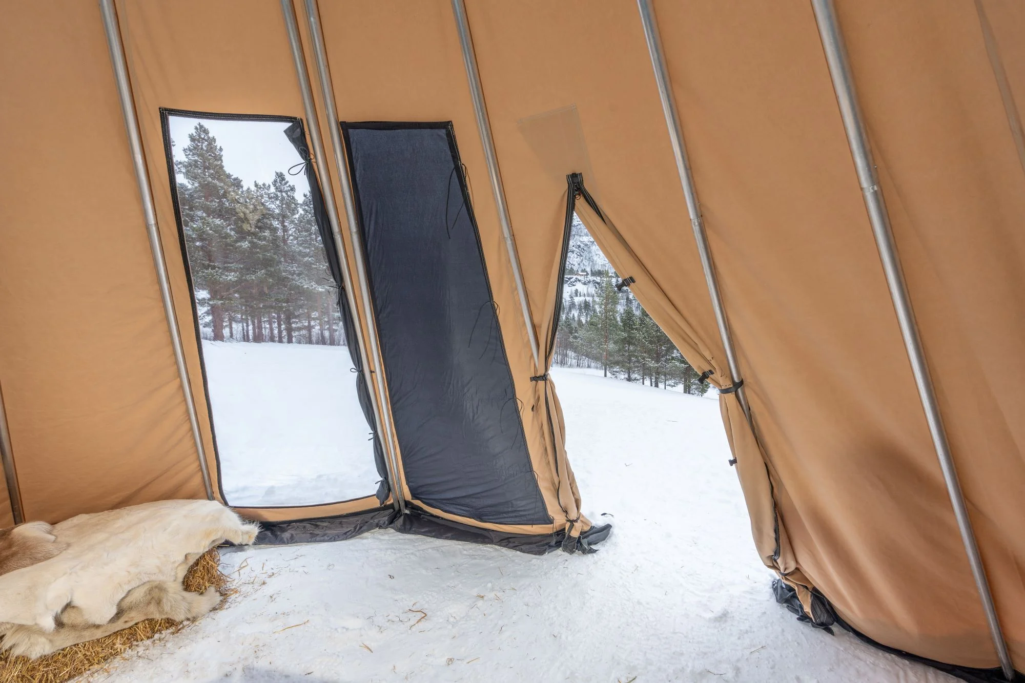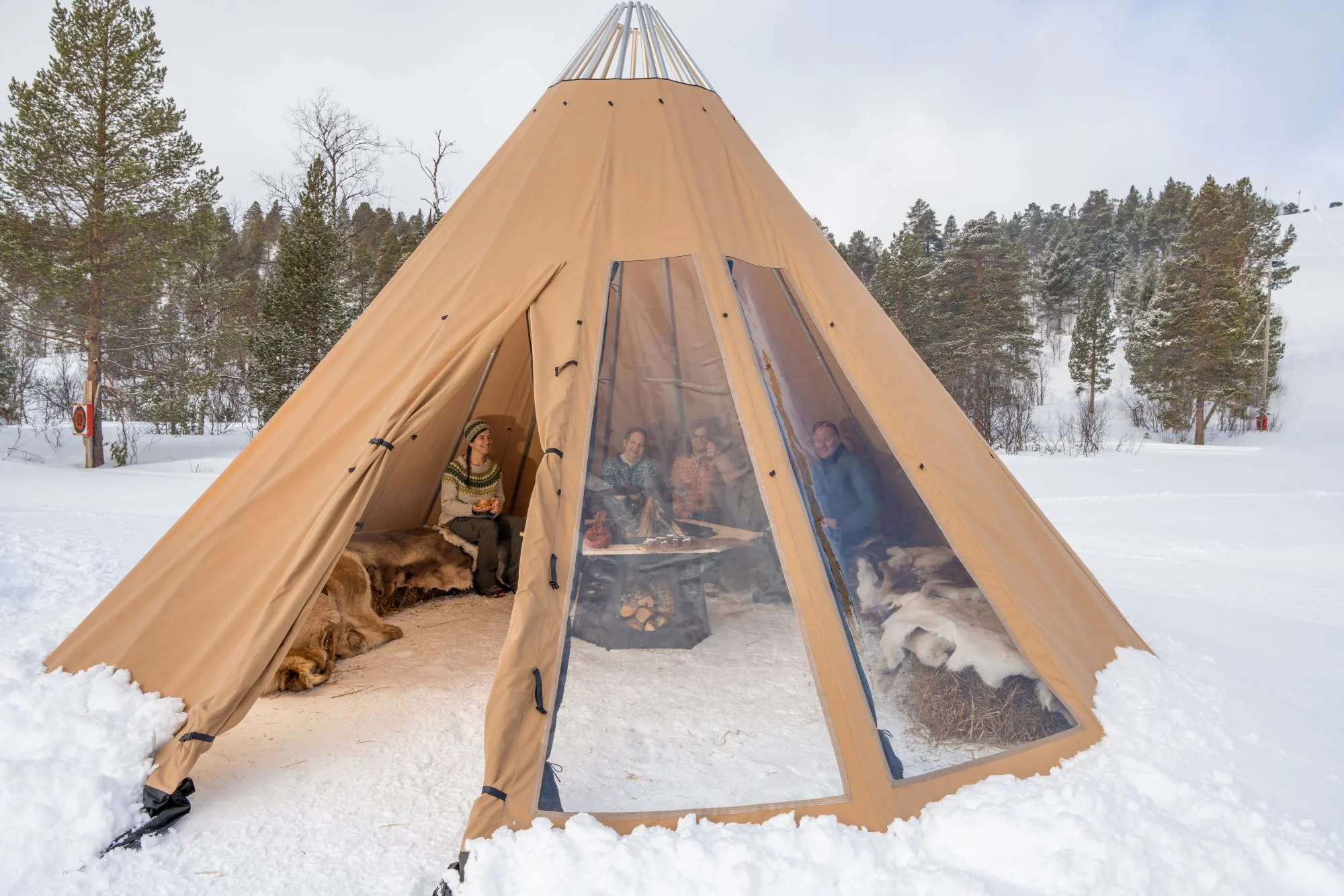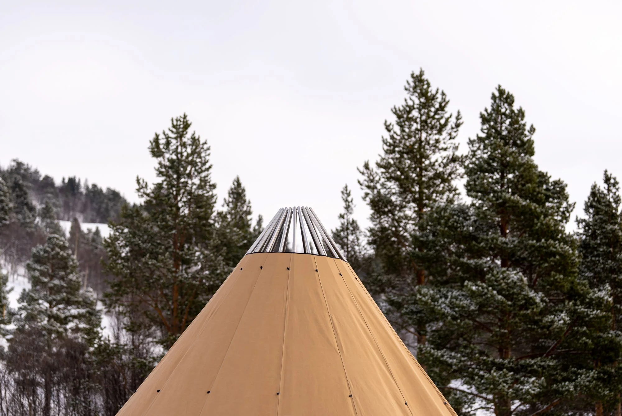 - Avtagbar ovnshatt med pipegjennomgang. Dersom du ønsker fyring med bål, må lavvoen brukes uten ovnshatt slik at røyken kan slippe ut.