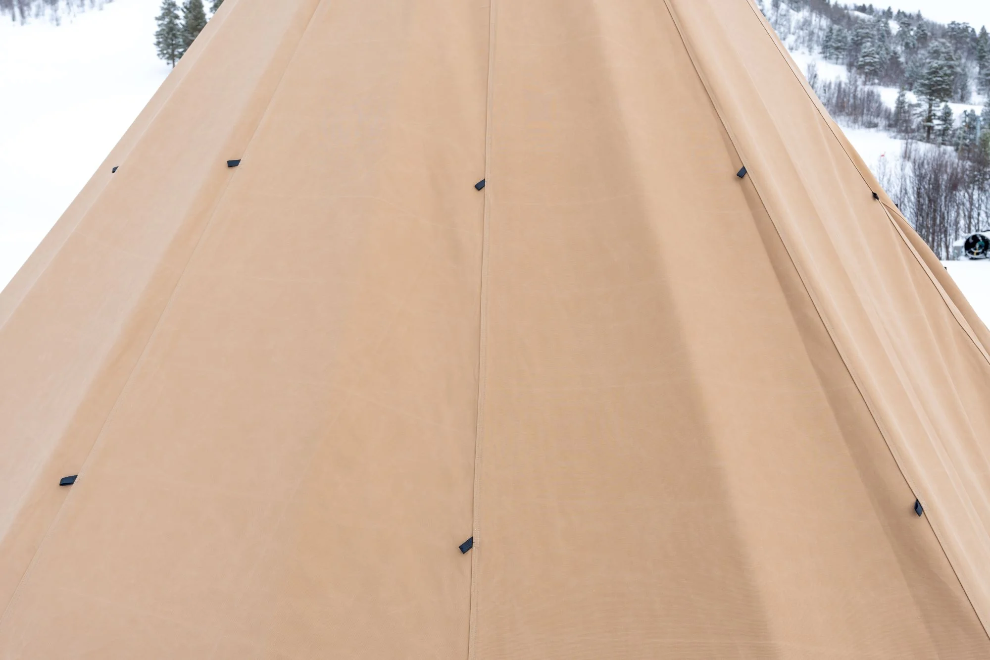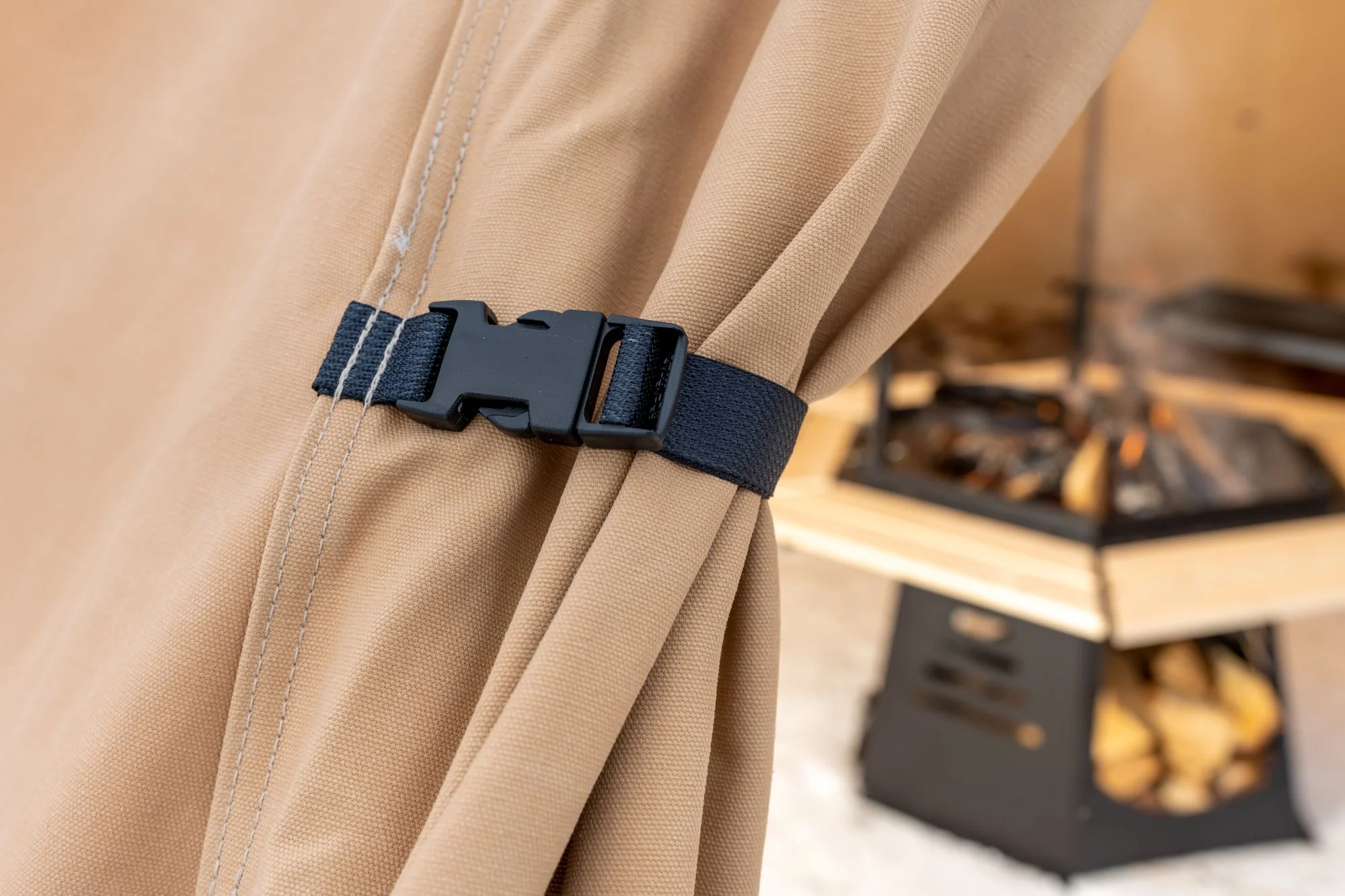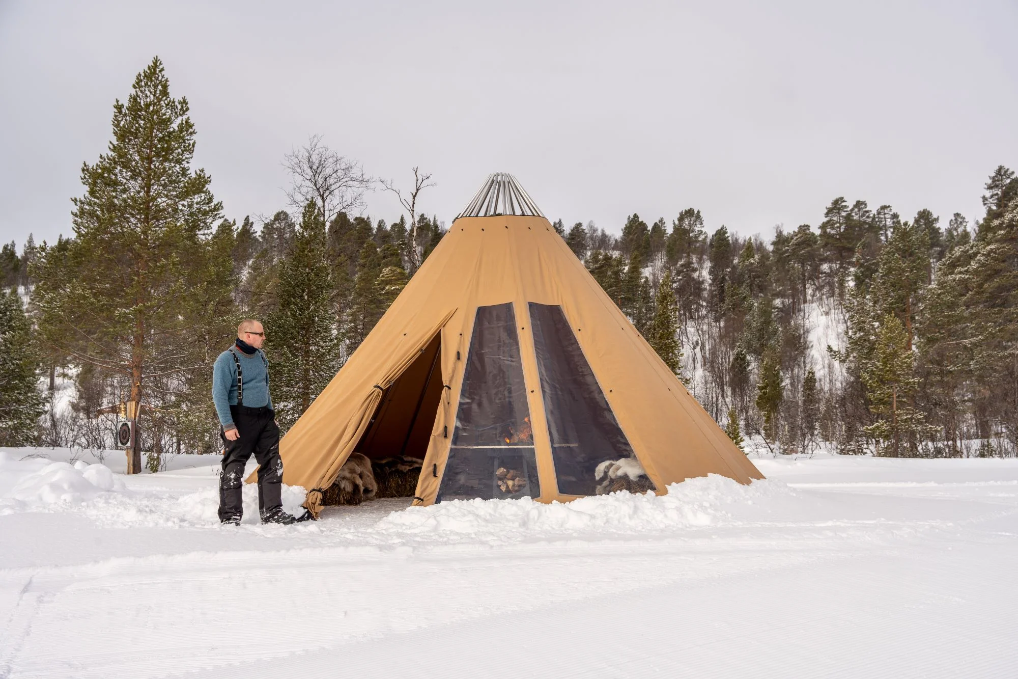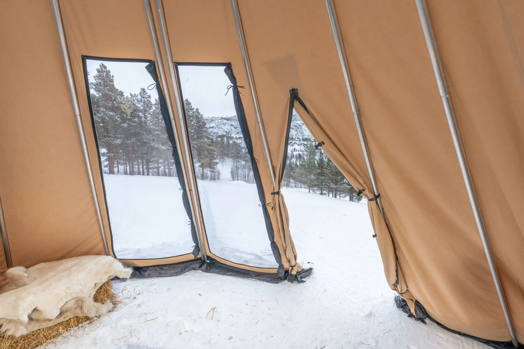 - Avtagbar ovnshatt med pipegjennomgang. Dersom du ønsker fyring med bål, må lavvoen brukes uten ovnshatt slik at røyken kan slippe ut.