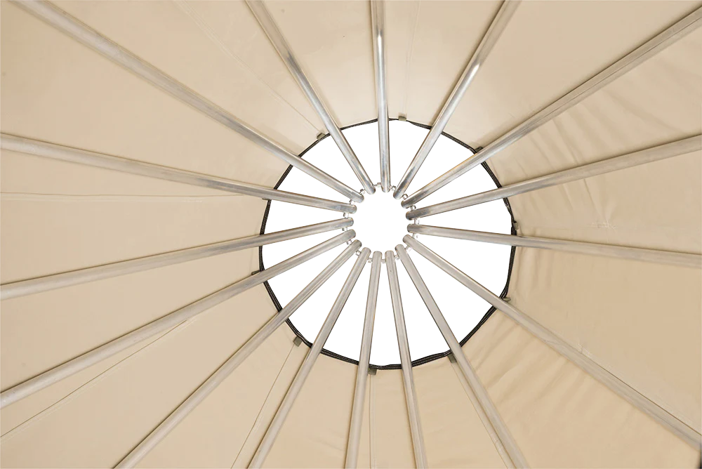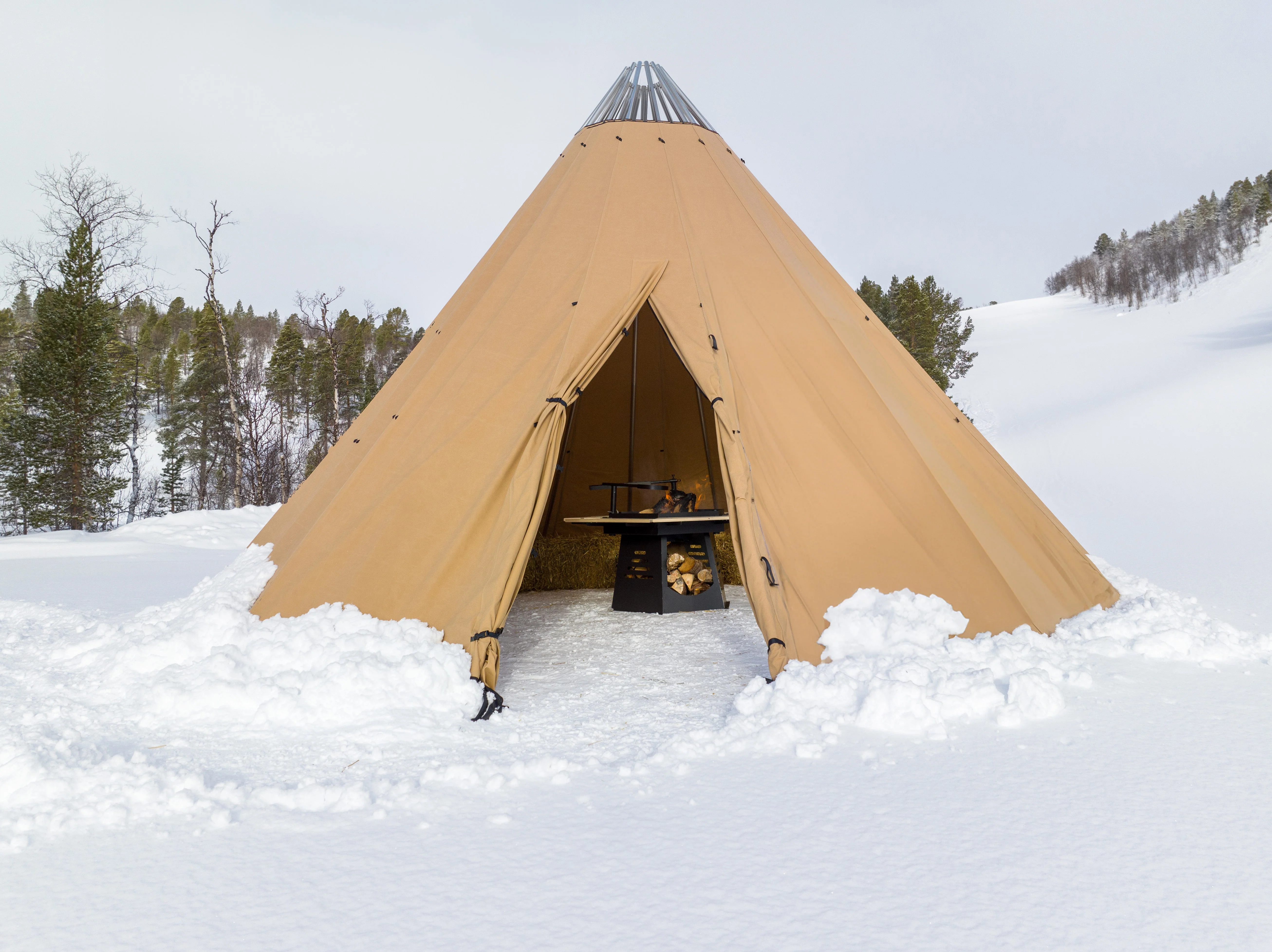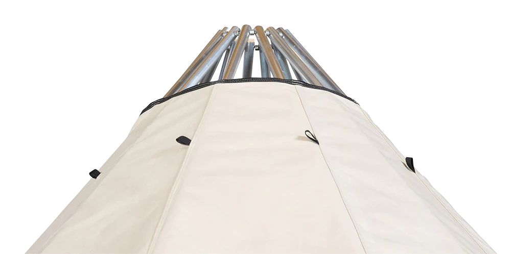 - Avtagbar ovnshatt med pipegjennomgang. Dersom du ønsker fyring med bål, må lavvoen brukes uten ovnshatt slik at røyken kan slippe ut.
