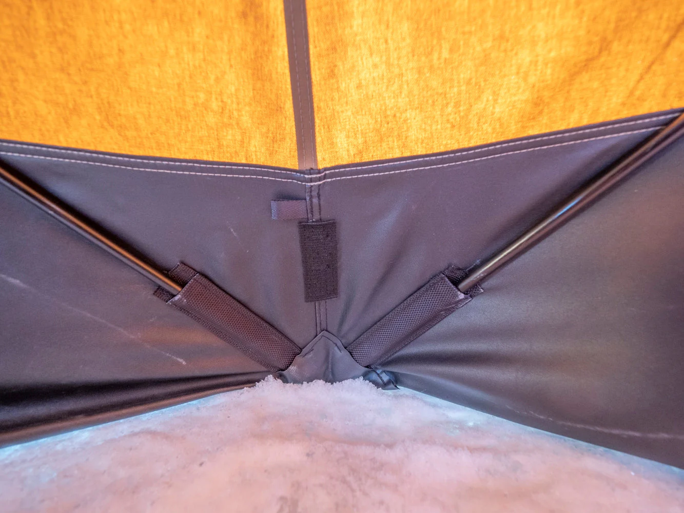 Venor PopUp har 12mm glassfiberbolt som stenger, som samles i en kraftig aluminiums-hubb. Stangkonstruksjonen sitter permanent fast i teltduken. Vi anbefaler å bruke medfølgende midtstang for å hindre at taket kan «poppe ned» av seg selv. Når du setter opp ditt telt bør du bruker alle barduner til hubbene for at teltet skal stå stabilt, spesielt under krevende forhold. Ventilen ved bakken kan åpnes for å ta slange til gassovn gjennom ventilen, for å ha gassflasken på utsiden av teltet.