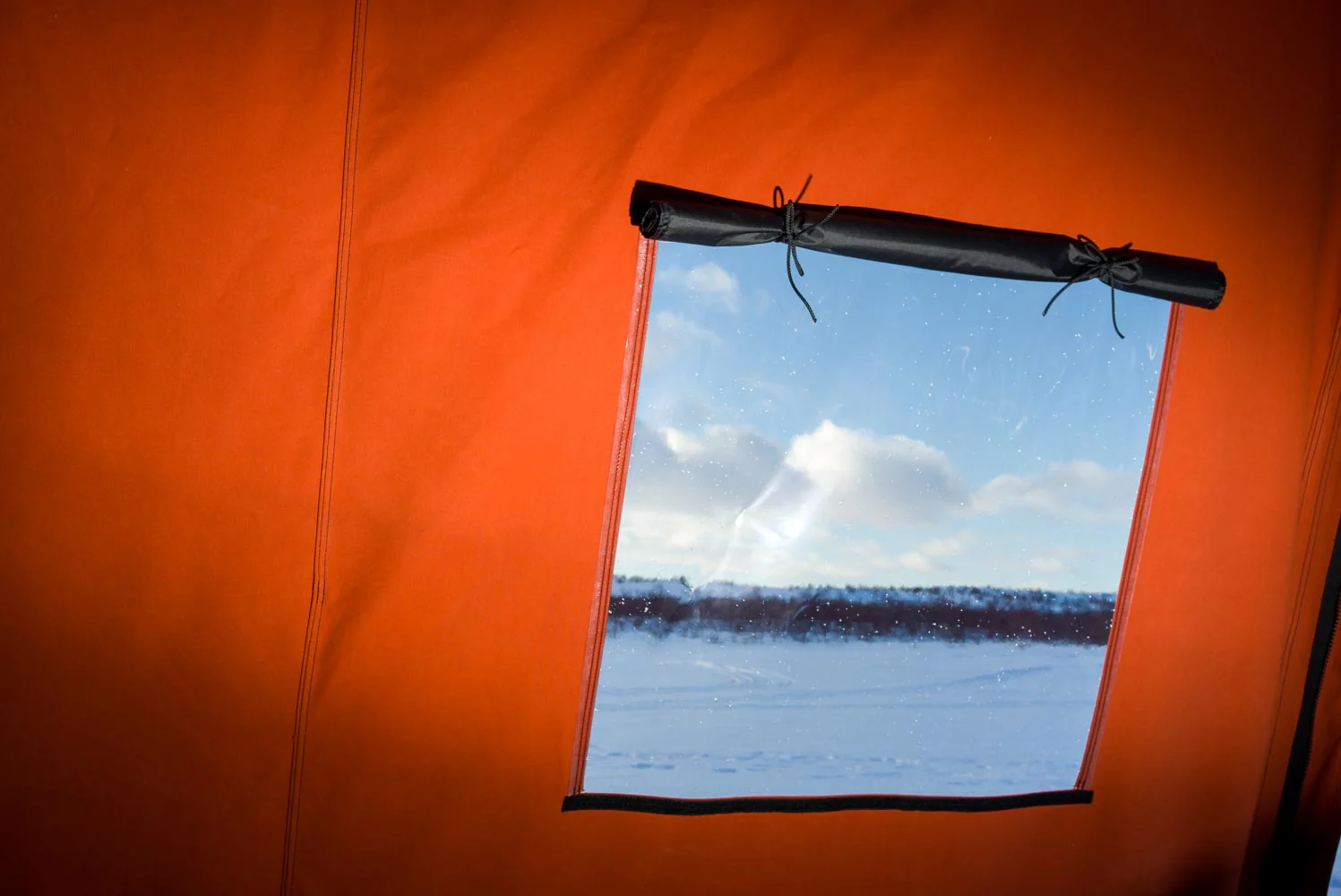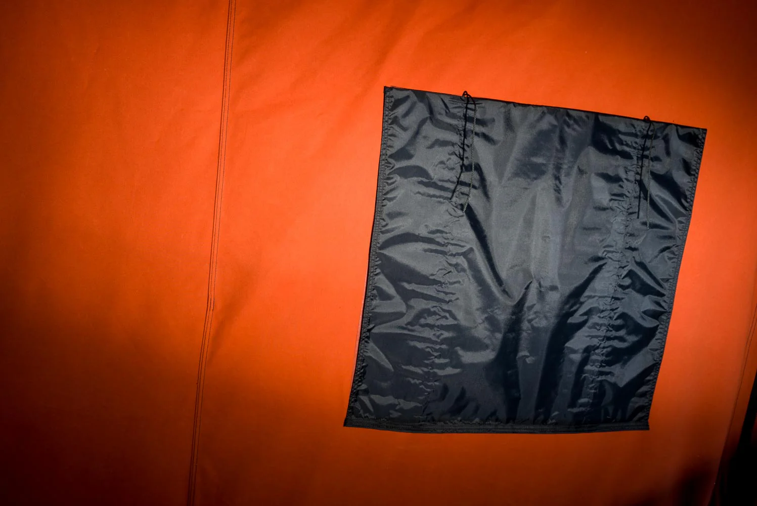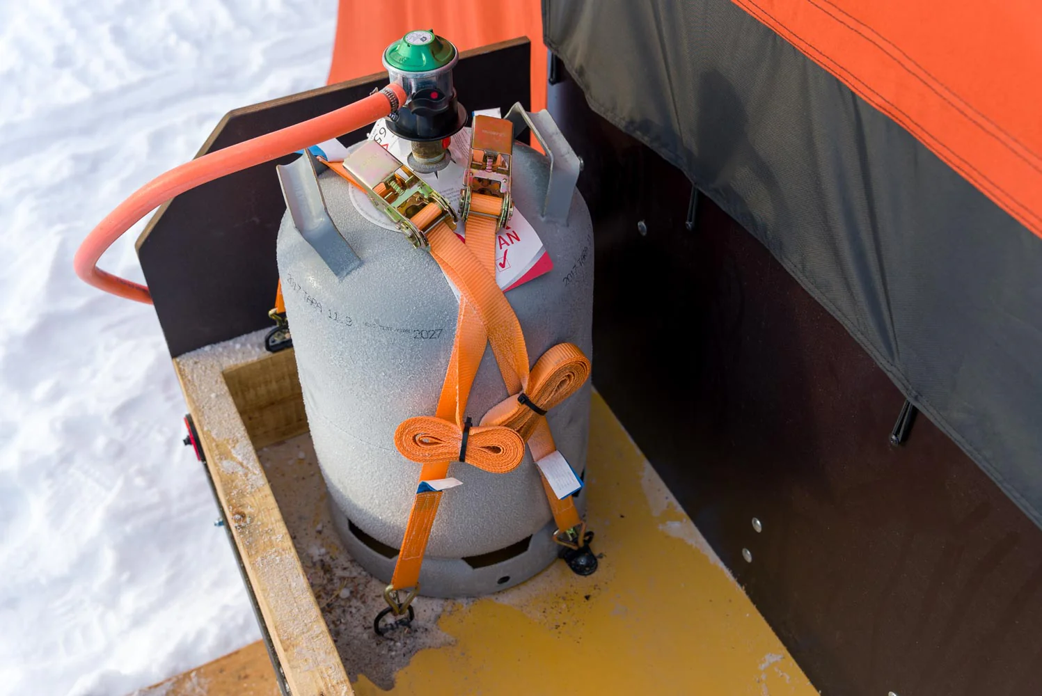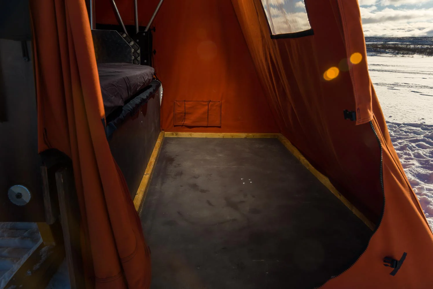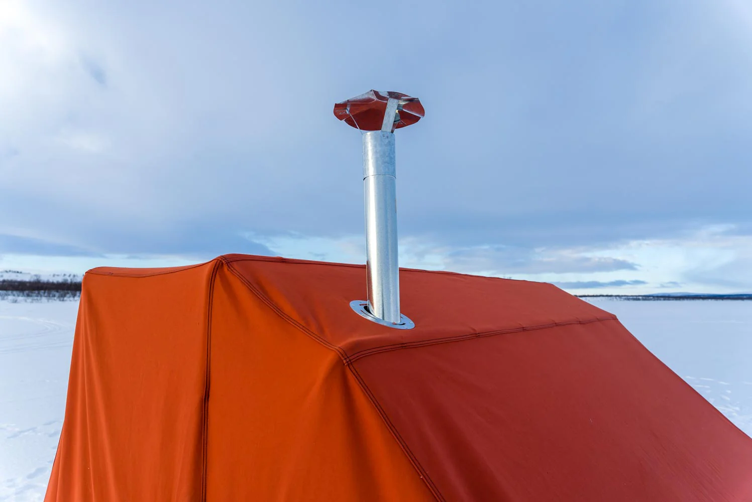 PopUp Sled leveres med valgfri plassering av gjennomgang for pipe, vi anbefaler ? bruke gass- eller vedovn for oppvarming.
