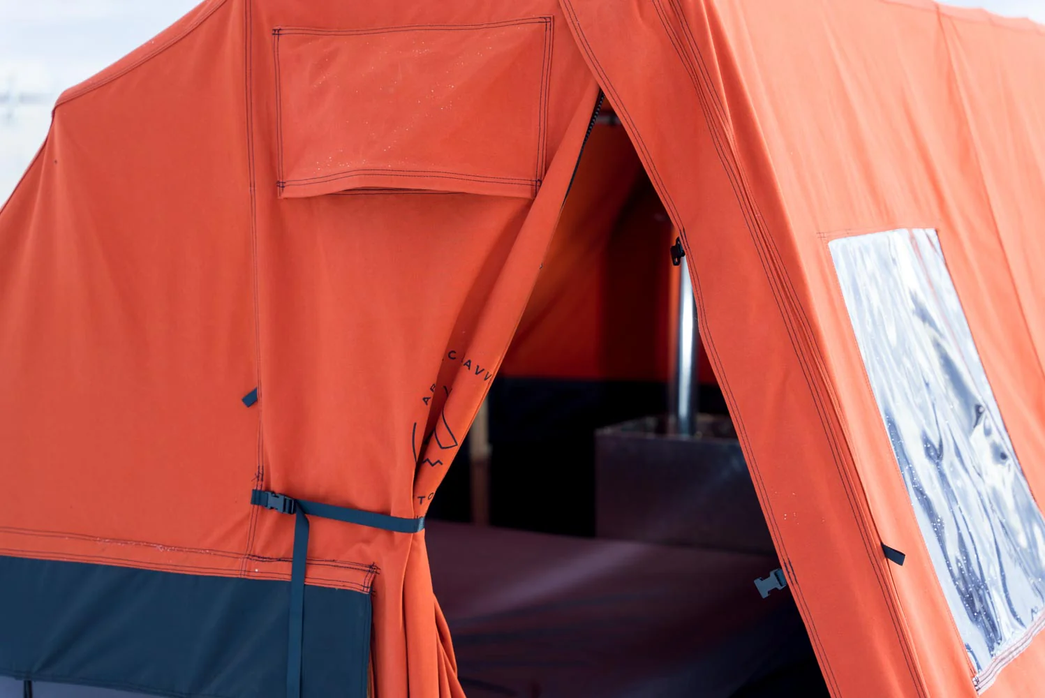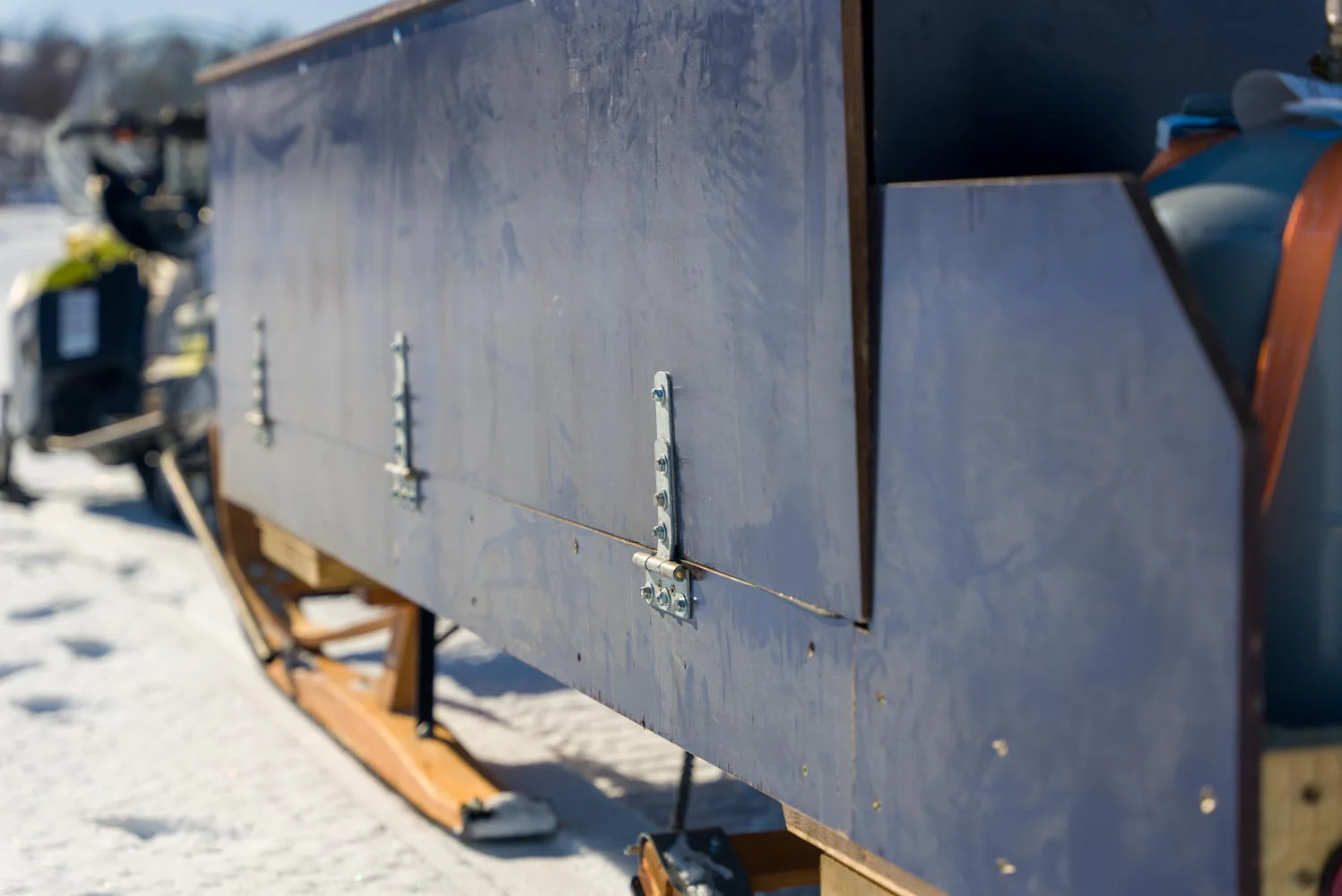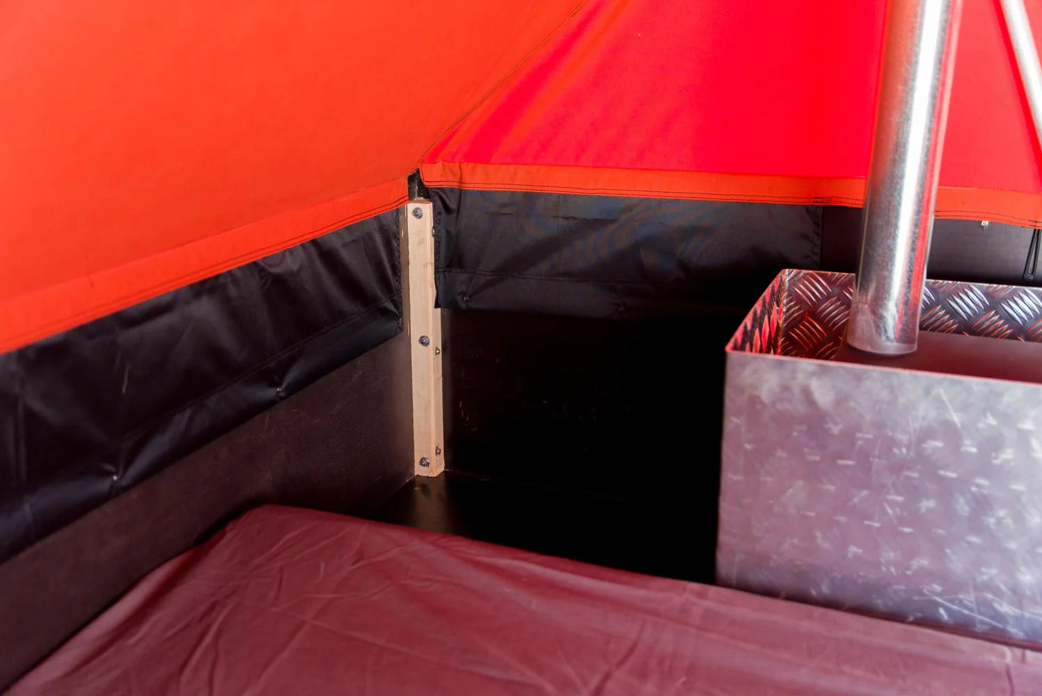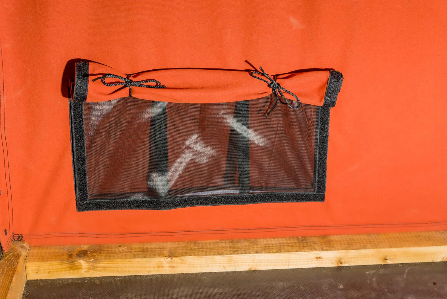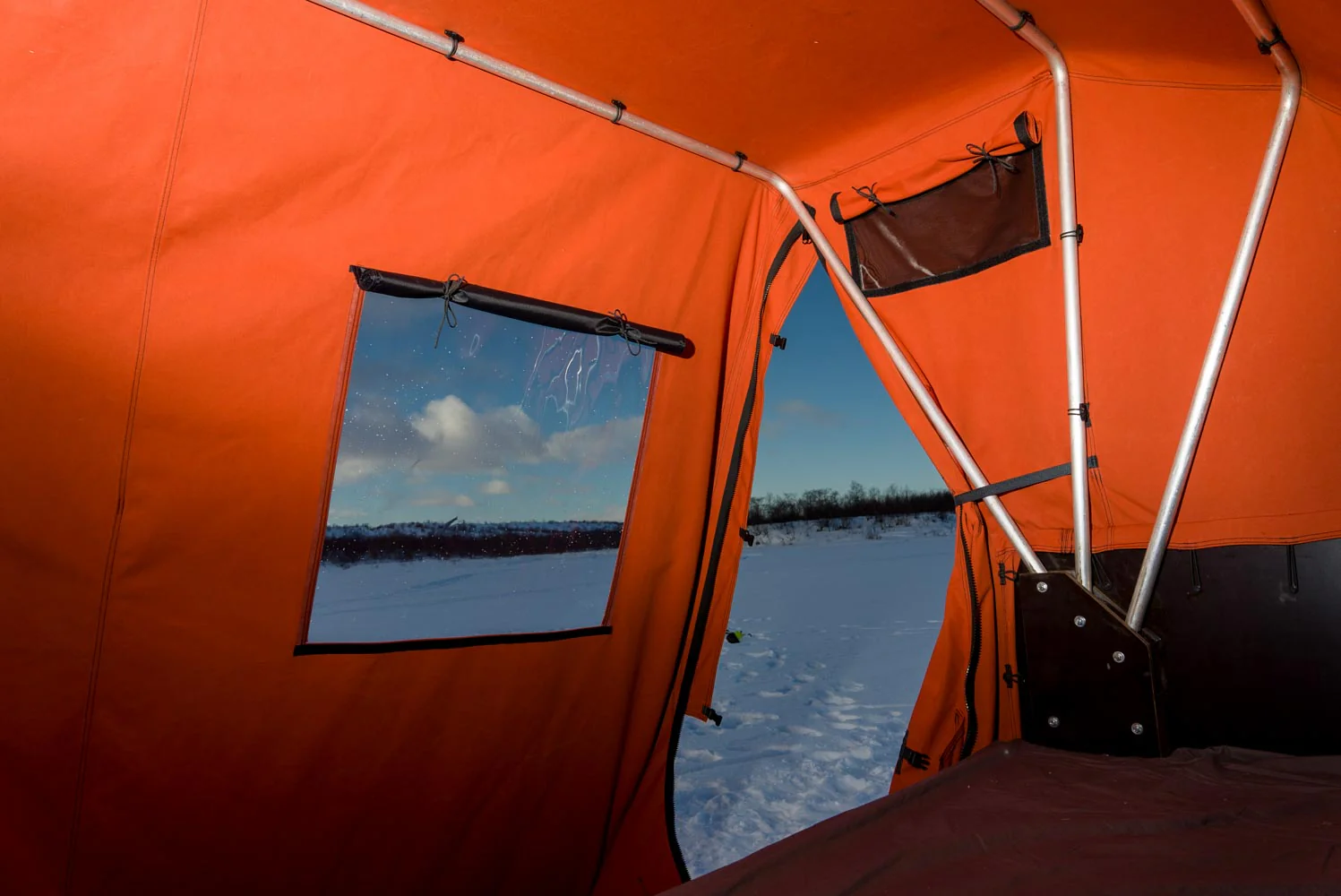 PopUp Sled leveres med valgfri plassering av gjennomgang for pipe, vi anbefaler ? bruke gass- eller vedovn for oppvarming.