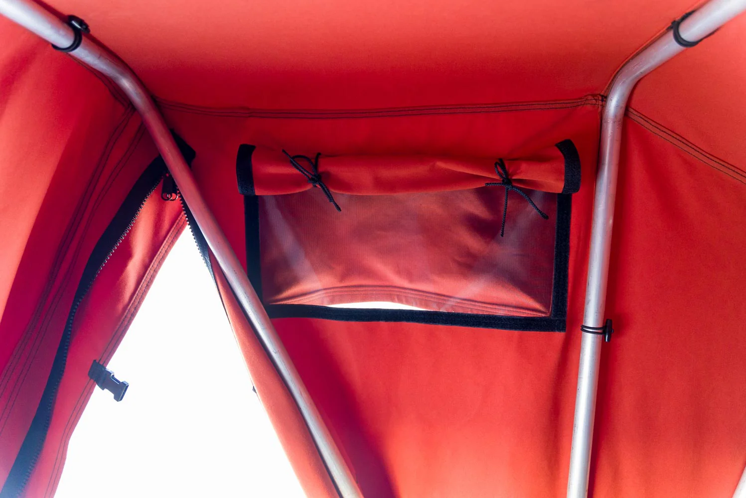 Teltet er festet i lokket og reiser seg automatisk i det lokket vippes opp. Lokket og festene til lokket er konstruert slik at det t?ler bevegelse/vridning under transport.