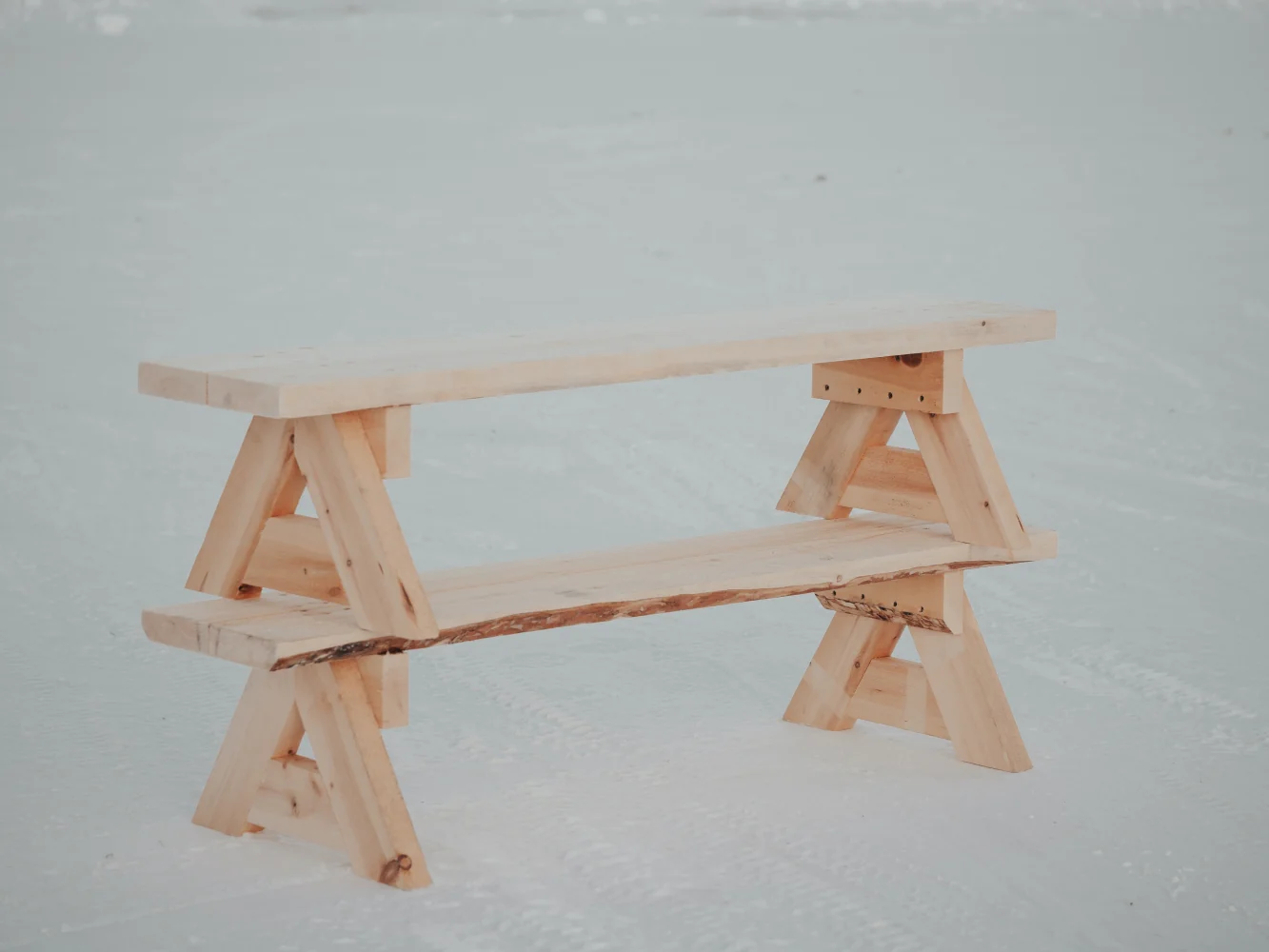 Benk i ubehandlet furu. Benken leveres flatpakket med skruer og ferdige skruehull. Benken passer utmerket for v?re lavvoer, b?lplasser, barnehager og lignende. Benken kan om ?nskelig overflatebehandles med maling eller beis, men vil ogs? vare i mange ?r uten behandling. Uten behandling vil treverket bli gr?tt etter noen bruk. Benken er tenkt for bruk utend?rs, i lavvo eller grillhytter. Den har en r?ff overflate, solid utf?relse og t?ler hard behandling. Foten er utformet slik at benkene enkelt kan stables opp p? hverandre for lagring og transport.
