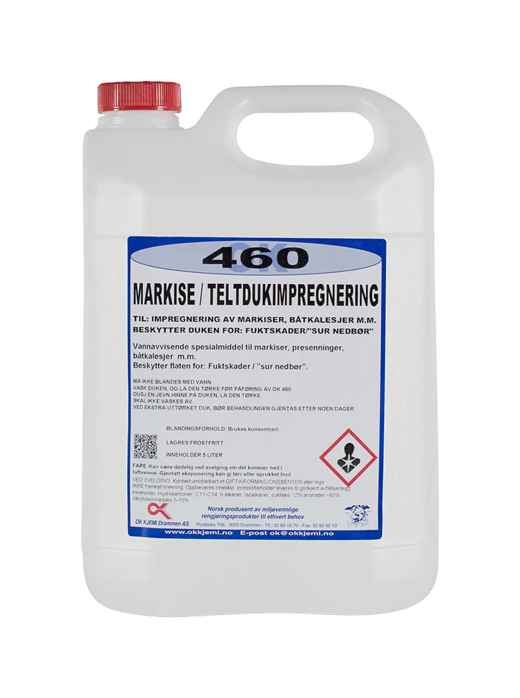 Impregnering OK460 er beregnet til etter-impregnering av lavvo- og gammeduk. Kan ogs? brukes til markiser og b?tkalesjer. Impregneringen beskytter duken mot fuktskader og sur nedb?r.